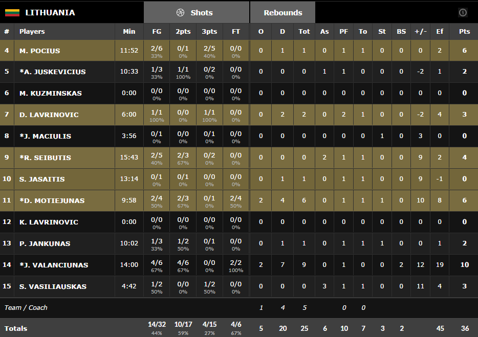 Corey Webster et Isaac Fotu ont bien démarré le second quart en inscrivant les 9 points de leur équipe pour remettre l’écart sous les 10 points, 27-18. Après 5 premières minutes compliquées, la Lituanie a recommencé à s’appuyer sur ce qui marchait en début de rencontre, le jeu intérieur. Ultra dominateur Jonas Vlanciunas (10 points, 9 rebonds et 2 contres), avec l’aide de Donatas Motiejunas a remis les siens sur les bons rails, 36-21. La Nouvelle-Zélande a mieux terminé la première mi-temps, ou plutôt la Lituanie l’a mal terminée puisqu’elle n’a pas mis le moindre point en 3’30 pour un 5-0 néo-zélandais et un score de 36-26 à la pause.