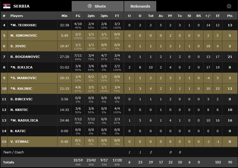 Bogdanovic fait encore très mal à 3-points et redonne 11 points d’avance à la Serbie, qui semble se diriger calmement vers une victoire. Petit à petit, la note s’allonge et la Serbie mène 76-60 à 5 minutes d’une qualification en quarts de finale. Score final 90-72.