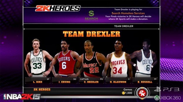 2K Sports a annoncé hier la présence d’un mode 2K Heroes pour les versions Xbox 360 et PlayStation 3 de NBA 2K15. C’est un mode qui permettra de contrôler et d’affronter des équipes de légendes en ligne et l’équipe qui remportera le plus de rencontres du lancement du jeu jusqu’au All-Star Game déterminera l’association qui profitera d’une donation de 2K Sports.