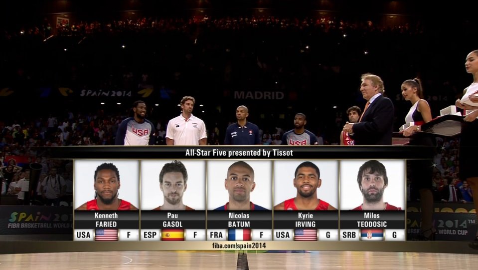 La FIBA a dévoilé le 5 majeur de la compétition et le MVP qui est Kyrie Irving. Le meneur de Team USA a réalisé une énorme finale avec 26 points et il a été le joueur américain le plus régulier sur le tournoi. Il termine avec 12.1 points à 56.2%, 2.6 rebonds, 3.6 passes et 1.9 interception.