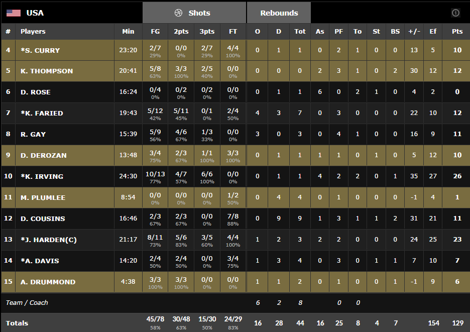 Pas de surprise dans cette finale puisque les Etats-Unis ont surclassé la Serbie 129 à 92. Les Serbes ont fait illusion pendant 3 minutes avant de prendre sur la tête une incroyable pluie de paniers, notamment à trois points (15/30) sur le match pour Team USA). Team USA a été emmenée par un duo Kyrie Irving – James Harden tout simplement monstrueux. Le premier termine avec 26 points et le second 23. 8 joueurs de Team USA marquent au moins 10 points !