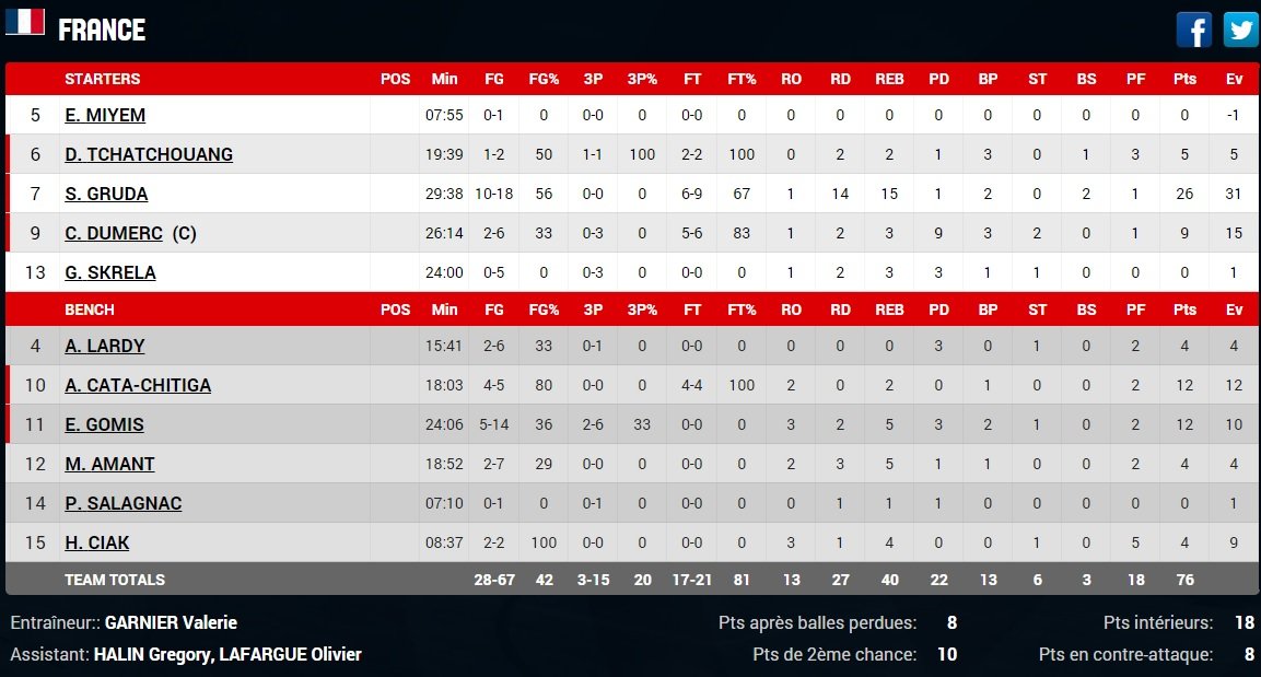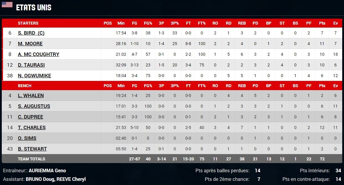 Céline Dumerc compile 9 points et 9 passes tandis qu’Emilie Gomis et Ana Maria Cata-Chitiga ajoutent 12 points chacune. Côté Team USA la MVP Maya Moore passe totalement à côté de son matcha avec 11 points à 1/10. Diana Taurasi fait à peine mieux avec 10 points à 3/13.