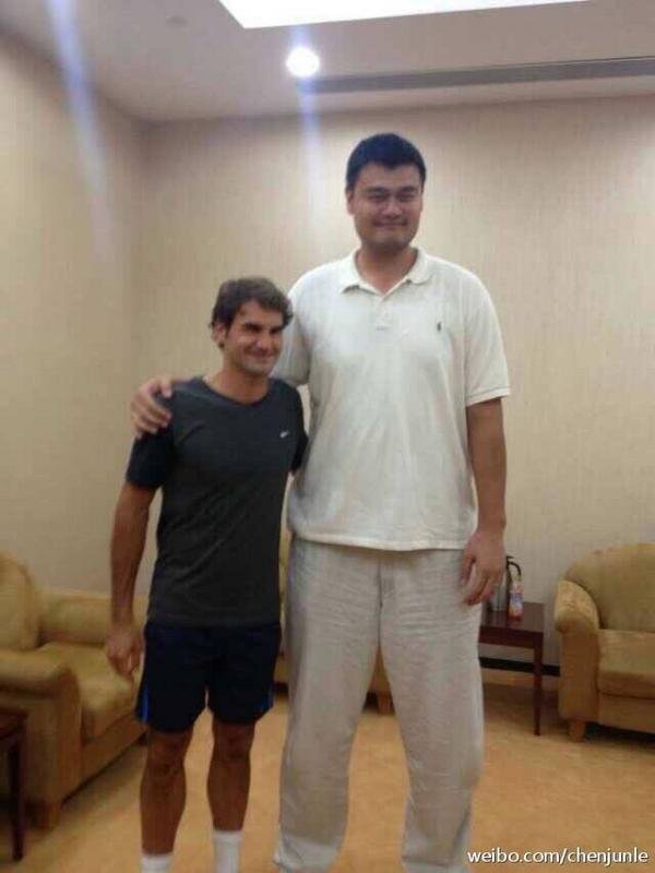 Cette semaine se tient le tournoi ATP de Shanghai, l’occasion pour Roger Federer et Novak Djokovic de rencontrer Yao Ming, qui possède une équipe là-baz. Il y a respectivement 44 et 41 centimètres qui séparent Yao Ming de Roger Federer et Novak Djokovic.