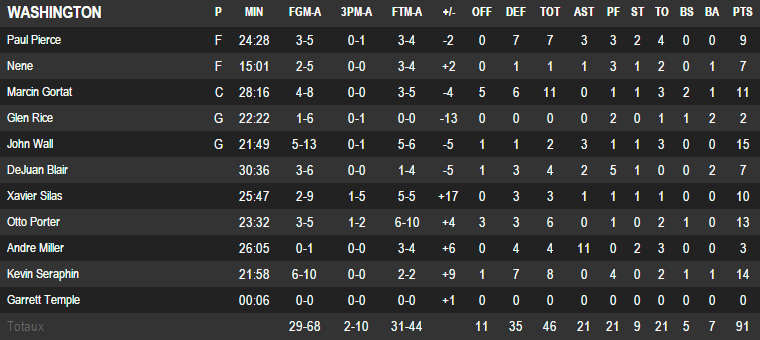 A noter les 17 points et 10 rebonds de Greg Monroe, les 13 points d’Otto Porter et les 10 unités de Xavier Silas.