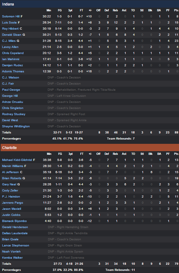 Les Pacers terminent sur une bonne note en battant les Hornets grâce à 23 points de CJ Miles et 15 de Luis Scola. En face Brian Roberts est le meilleur marqueur avec 19 points tandis qu’Al Jefferson en inscrit 15.
