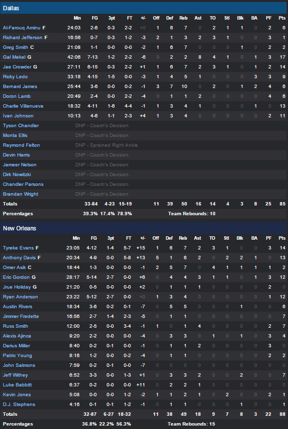 Enfin les Pelicans battent Dallas 88-85 fans le sillage du quatuor Ryan Anderson (12 points), Eric Gordon (12 points), Anthony Davis (13 points) et Tyreke Evans (14 points). En face nouvelle bonne performance de Gal Mekel avec 17 points.
