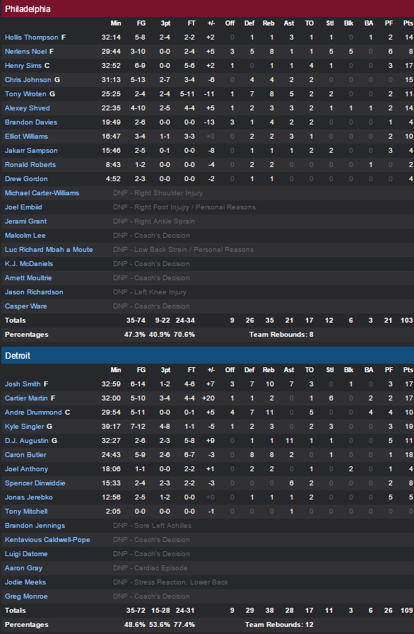 Detroit vient à bout des Sixers avec 6 joueurs entre 10 et 19 points. 19 points Kyle Singler, 18 pour Caron Butler et 17 pour Josh Smith (et 10 rebonds) et Cartier Martin. Henry Sims est le meilleur marqueur des Sixers avec 17 points.