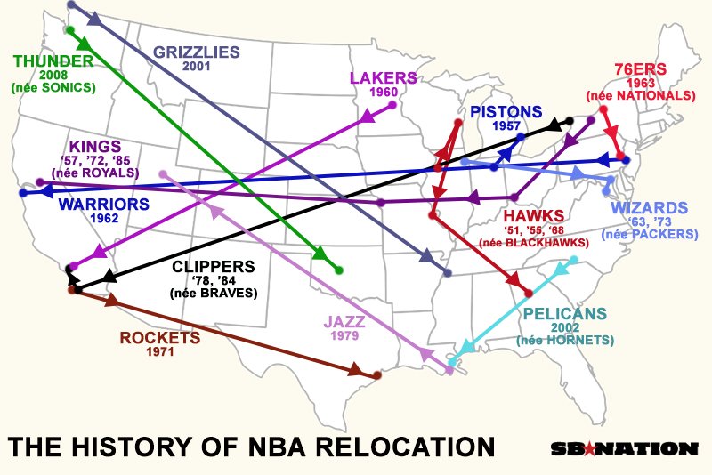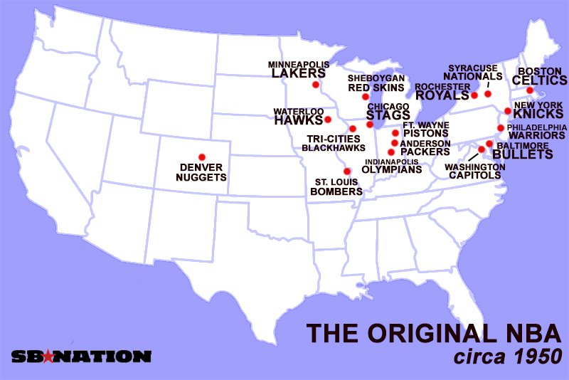Énorme travail d’infographie signé SBNation avec 20 cartes qui expliquent l’histoire de la NBA de ses débuts en 1946 (elle s’appelait alors encore BAA pour Basketball Association of America avant de fusionner avec la NBL : National Basketball League en 1949) à aujourd’hui. Certaines sont très sérieuses et instructives, d’autres sont à prendre avec plus d’humour (les voyages de Drew Gooden à travers les États-Unis par exemple).