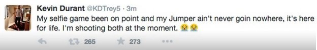 Prenant en compte sa fracture du pied et son absence jusqu’à début décembre au moins, ESPN fait affront à Kevin Durant en le classant 8e meilleur joueur NBA. Royce Webb a tapé dans le mille lorsqu’il a écrit que le MVP en titre shootait actuellement plus de selfies que de jumpers. L’ailier du Thunder ne s’est pas privé de répondre à ce classement avec humour avant de décider d’effacer son tweet.