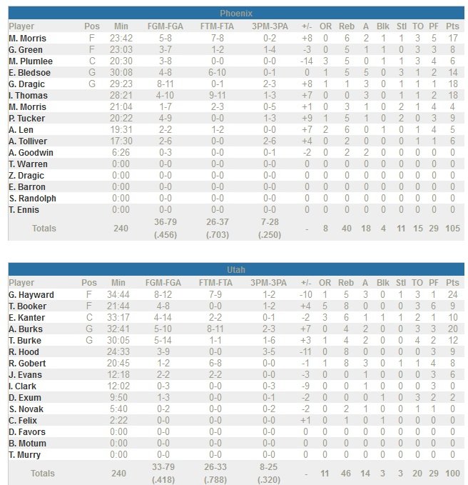 San Antonio perd malgré les 30 minutes de jeu de Tony Parker, plutôt maladroit (2/7) mais altruiste cette nuit (10 passes) et les 19 points de Marco Belinelli alors que 4 joueurs des Rockets ont inscrit plus de 10 points pour s’imposer 96-87. Chris Bosh s’est éclaté face à une raquette de Memphis préservée (21 points à 8/14) alors que Phoenix a eu besoin de 17 et 18 points des frères Morris pour venir à bout du duo Gordon Hayward/Alec Burks.