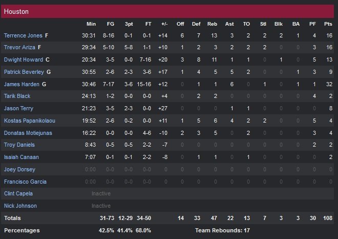 Dwight Howard (13 points 11 rebonds) ne démarre pas son match sous les meilleurs auspices en écopant de deux fautes en cinq minutes mais son équipe s’occupe d’infliger un 18-9 aux Lakers d’entrée de match. L’hécatombe continue et Los Angeles, menée 31-19, commence à sérieusement inquiéter sur son niveau de jeu à la fin du troisième quart-temps après un 7-0 en faveur de Houston. Kobe Bryant se montre plus percutant en deuxième quart avec 8 points à 4/9 et les siens reviennent à 39-31. L’arrière (16 points à 6/13 en première mi-temps) poursuit ses efforts jusqu’à la mi-temps mais les Lakers ont toujours un lourd retard à rattraper à la pause, 62-45.