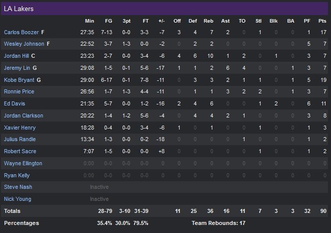 Jeremy Lin profite de l’absence forcée de Dwight Howard, qui a pris sa 4e faute deux minutes après le début du troisième quart-temps, pour servir Carlos Boozer sur un plateau. Les Lakers Après un peu moins de 4 minutes de jeu, les Lakers sont revenus à 65-52 puis parviennent à revenir à 9 points (ils ont compté jusqu’à 18 points de retard en première mi-temps) une nouvelle fois sur un Boozer agressif dans la peinture après 5 minutes de jeu dans le troisième quart. L’écart repasse rapidement à 10 points (69-59). Alors que Los Angeles a tout le mal du monde pour obtenir un 3-points à la fin des 24 secondes, Houston n’a aucun mal à répondre à l’image de l’ancien Laker Trevor Ariza qui enchaîne les perles et de James Harden (32 points à 7/17 et 6 passes), qui poursuit son festival après avoir inscrit 22 points à la mi-temps.