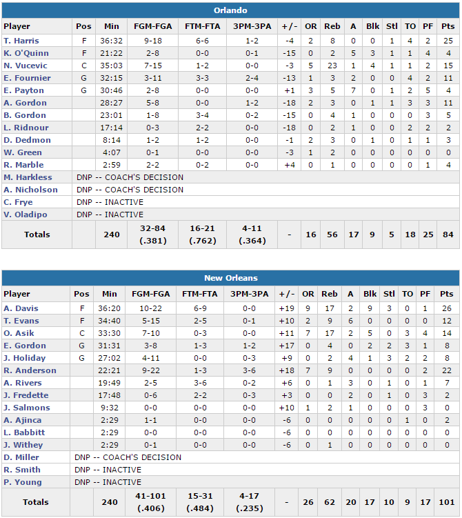 Davis a également bien été épaulé par l’ancien du Magic Ryan Anderson, revenu de blessure (22 points) et son nouveau compère dans la peinture Omer Asik (14 points 17 rebonds et 5 contres). Le tandem a dominé à l’intérieur en combinant pour 16 rebonds offensifs apportant 32 points en deuxième chance. Orlando aura pourtant mené de jusqu’à 6 points dans le premier quart-temps sur un layup signé Vucevic mais les Pelicans contrôlent le deuxième quart et prennent une avance 48-41 sur une claquette dunk de Davis quelques secondes avant la mi-temps. L’écart se creuse en fin de troisième quart (14 points) grâce à Anderson, qui avait manqué 9 de ses 13 premiers shoots.