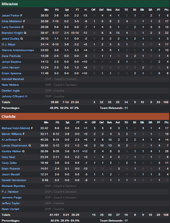 Les Bucks peuvent s’en vouloir d’avoir laissé échapper ce match puisqu’ils ont compté jusqu’à 24 points d’avance (74-50 en troisième quart), soit le plus gros comeback de l’histoire des Hornets. Brandon Knight (22 points et 13 passes), OJ Mayo (17 points) et Khris Middleton (17 points) avaient fait le boulot, bien épaulés par les 10 points chacun de Larry Sanders et Giannis Antetokounmpo. Mais Lance Stephenson (7 points, 13 rebonds et 8 passes), Kemba Walker, Al Jefferson (14 points, 10 rebonds), Michael Kidd-Gilchrist (17 points à 6/8 et 8 rebonds) et Cody Zeller (11 points) ont relevé la tête et ramené progressivement Charlotte. A 15 points à la fin du troisième, Charlotte comptait encore 13 points de retard à 5 minutes de la fin mais Milwaukee n’a plus marqué le moindre panier jusqu’au buzzer.
