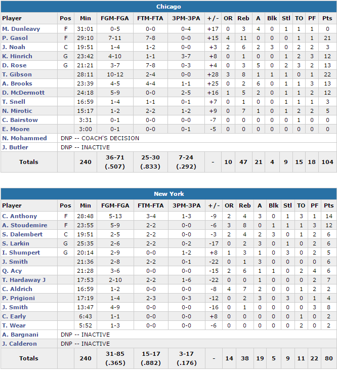 Avec seulement deux joueurs à au moins 10 points, Carmelo Anthony (14 points à 5/13) et Amar’e Stoudemire (12 points), les Knicks n’ont eu aucun chance compte tenu de leur incapacité à stopper les Bulls à l’intérieur à l’image du 17/23 en combiné de Gasol et Gibson qui a permis à Chicago d’avoir un avantage dans la raquette de 42-28 et une adresse générale de 51%. Le banc de Chicago inscrit 30 points à 13/17 contre 23 à 6/23 aux Knicks en première mi-temps.