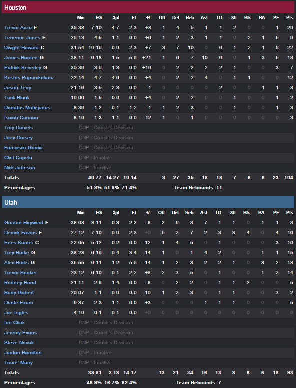 Au retour des vestiaires les Texans ont profité de la maladresse des locaux pour prendre pour la première fois du match plus de 10 points d’avance 75-62. Toutefois Trevor Booker (14 points) et Trey Buke (15 points) ont à eux d’eux permis au Jazz de revenir à distance respectable sur un 10-0 lors des 3 dernières minutes du quart (75-72). Mais l’espoir a été de courte durée en dernier acte puisque les hommes de Quin Snyder ont raté 13 de leurs 15 premiers shoots, laissant les Rockets s’envoler sur un 18-5 fatal.