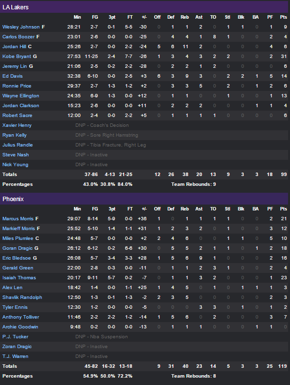 En début de seconde mi-temps la défense des Lakers a subi la fougue des locaux et notamment du trio Goran Dragic et des frères Morris pour un 16-4 qui a plié la rencontre. Phoenix a alors pris plus de 20 points d’avance sur un 34-11, l’écart culminant à 29 unités malgré un Kobe Bryant qui tentait ce qu’il pouvait et qui a finalement terminé avec 31 points ( à 11/25) en trois quart temps.