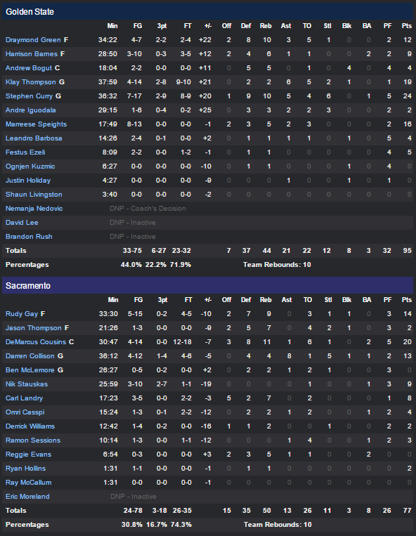 Stephen Curry a signé 24 points et 10 rebonds et Klay Thompson a ajouté 19 points pour faire la différence en compagnie de Marreese Speights (16 points) et Draymond Green (12 points et 10 rebonds). La première mi-temps a été compliquée pour les deux équipes, maladroites et elles ont ainsi fait jeu égal avec d’un côté les Splash Brothers et de l’autre DeMarcus Cousins (20 points à 4/14) et Rudy Gay (14 points à 5/15). La bonne fin de mi-temps de ces deux derniers a même donné 6 points d’avance aux Kings avant que les Warriors ne recollent à 47-49 dans les derniers instants.