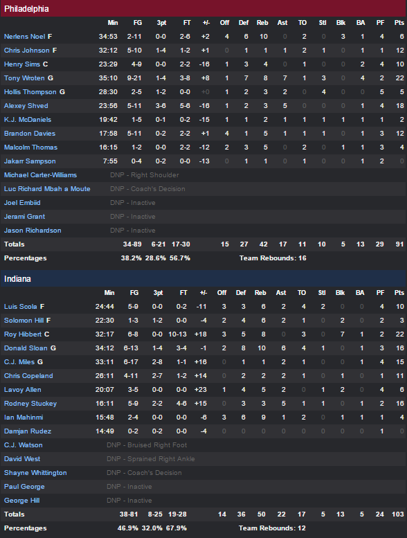 Malgré toutes les absences les Pacers débutent par un succès et Roy Hibbert a répondu présent avec 22 points, 8 rebonds et 7 contres. Il a été bien aidé par le trio Donald Sloan (16 points), CJ Miles (15 points) et Rodney Stuckey (16 points). La différence s’est faite en seconde mi-temps puisque les Sixers ont fait la course en tête en début de rencontre grâce à Tony Wroten (22 points à 9/21) et Brandon Davies (12 points) mais en troisième quart le trio Hibbert, Sloan et Miles a donné une dizaine de points d’avance en troisième quart. Stuckey et Copeland ont fini le travail en début de dernier quart.