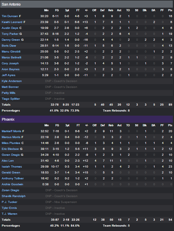 Phoenix s’est appuyé sur son trio de meneurs Isaiah Thomas, Eric Bledsoe et Goran Dragic pour faire la différence et martyriser la défense texane en fin de rencontre. Les Spurs avaient parfaitement débuté ce match puisqu’ils ont passé un 18-3 aux Suns en milieu de quart pour mener 24-9 après un tir à trois points de Boris Diaw. Les Suns ont shooté à un catastrophique 5/23 dans le quart dont 10 paniers ratés de suite avant une claquette d’Alex Len pour conclure le quart, 21-10.