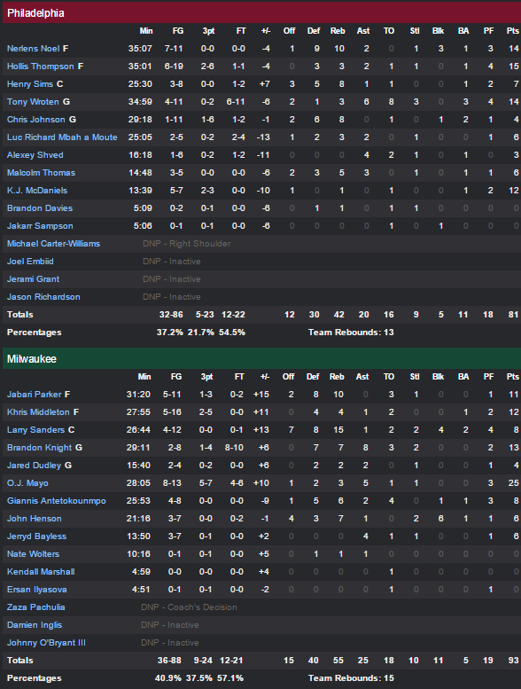 Jabari Parker termine avec 11 points et 10 rebonds, Brandon Knight 13 points, 7 rebonds et 8 passes tandis que Larry Sanders signe 8 points, 15 rebonds et 4 contres. Les Sixers ont payé leur manque d’adresse (37.2%) puisque le seul titulaire à au moins 50% c’est Nerlens Noel avec 14 points à 7/11 et 10 rebonds. Thompson inscrit 15 pints à 6/19 et Tony Wroten 14 à 4/11 tandis que Chris Johnson a lui rentré un seul shot sur 11 tentatives.