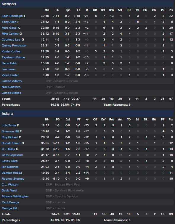 Comme lors de leur premier match ils se sont appuyés sur leur doublette intérieure Zach Randolph – Marc Gasol. Les deux ont combiné 42 points et 19 rebonds et dominé la raquette des Pacers avec un Roy Hibbet pas aussi présent que lors du match d’ouverture (8 points et 8 rebonds)