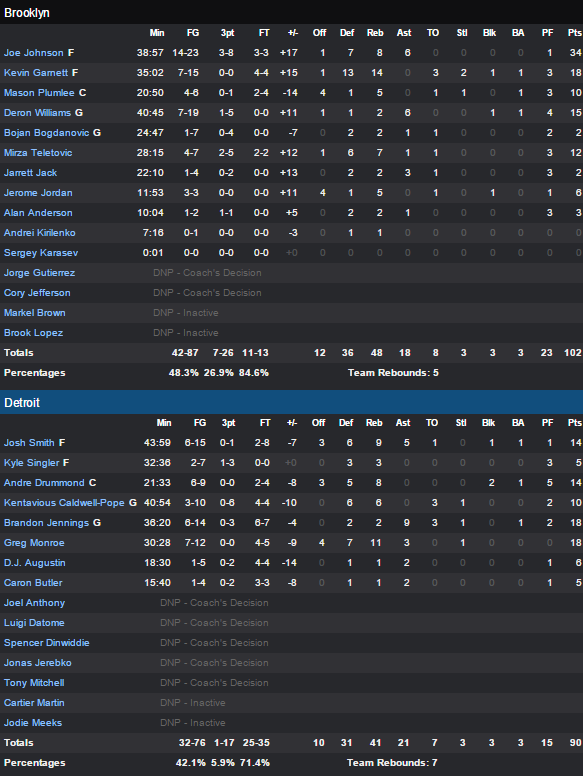 Kevin Garnett réussit son meilleur match depuis bien longtemps avec 18 points et 14 rebonds alors que Deron Williams ajoute 15 points. Pour sonre tour et son nouveau statut de remplaçant Greg Monroe fait un bon match et termine meilleur marqueur de son équipe à égalité avec Brandon Jennings, 18 points.