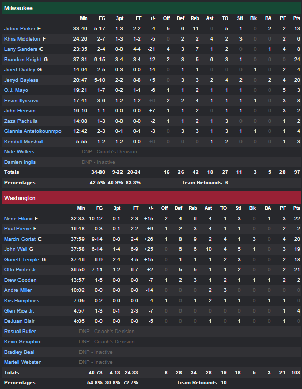 Malgré l’expulsion de Paul Pierce en première mi-temps les Wizards s’en sont bien sortis face aux Bucks, Otto Porter remplaçant parfaitement le vétéran avec 21 points. Le quatuor John Wall, Marcin Gortat, Garett Temple et Nene n’est pas en reste avec en combiné 79 points. Washington s’est appuyé sur un 20-9 en début de rencontre pour mener tout le match, gardant les Bucks à distance malgré les 24 points de Brandon Knight et les 20 de Jerry Bayless. Malgré un retour à 3 points en troisième quart Milwaukee n’a jamais pu vraiment inquiéter les locaux.