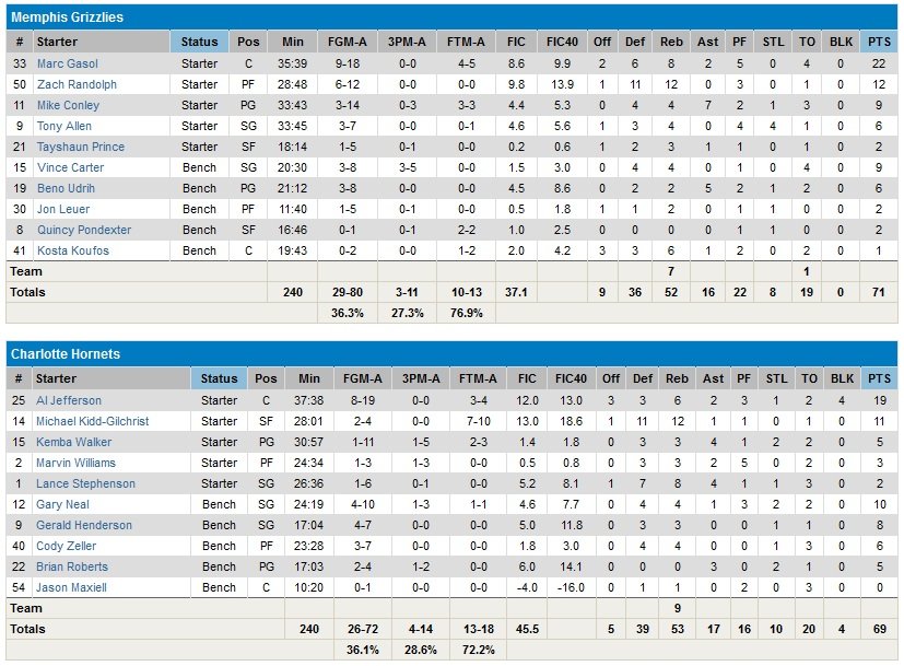 Une victoire moche mais efficace en somme. Menés par Al Jefferson (19 points à 8/19 et 6 rebonds) et Michael Kidd-Gilchrist (11 points et 12 rebonds), les Hornets n’ont pas vu leur recrue de l’été. Lance Stephenson termine le match avec seulement deux points en 26 minutes et n’a même pas joué le dernier quart-temps. Son coach lui a préféré Gary Neal pour terminer la rencontre. En première mi-temps, les Grizzlies limitent le trio Jefferson-Stephenson-Walker à un maigre 2/14 aux tirs et mène 36-30 à la pause malgré un Kidd-Gilchrist comptant déjà 10 points et 10 rebonds après deux quart-temps.