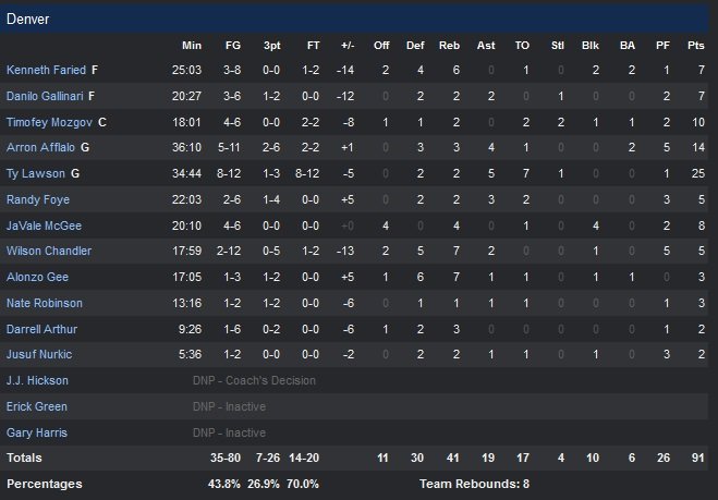 Tués par leur pourcentage de réussite en première mi-temps (34% et 1/10 derrière la ligne), les Nuggets sont qualifiés de zombies par leur coach à la fin du match… Prochain rendez-vous pour les Nuggets, la réception de Sacramento lundi. Côté Thunder, un voyage à Brooklyn est prévu lundi.