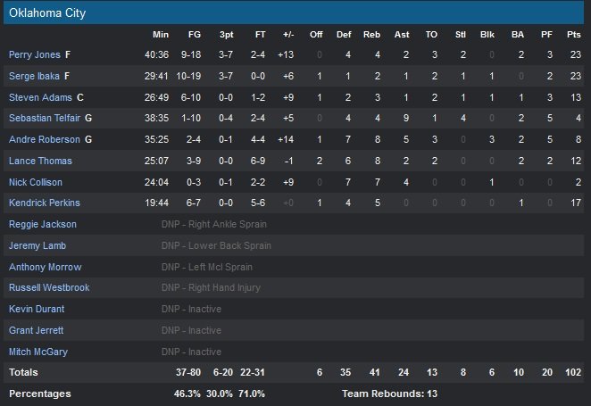 Sans Kevin Durant, Russell Westbrook, Reggie Jackson et Anthony Morrow, le Thunder peut pour le moment compter sur un Perry Jones III en grande forme. L’ailier de 2,11m a inscrit 23 points ainsi qu’un 3-points clutch cette nuit pour aider une équipe d’Oklahoma City décimée à s’imposer face aux Nuggets, 102-91. L’équipe (seulement 8 joueurs disponible pour Scott Brooks) s’est également regroupée autour de Serge Ibaka (23 points), Kendrick Perkins (17 points) et Steven Adams (13 points).