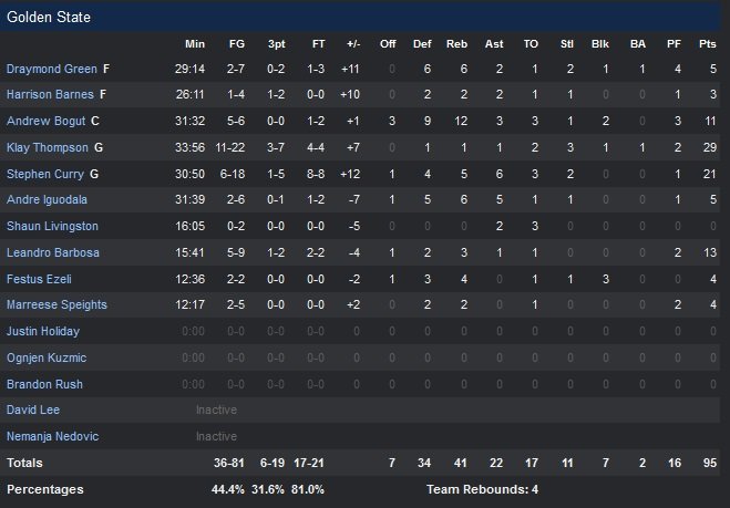 Les égalités se multiplient entre les deux franchises. La fin de match se transforme en duel entre Klay Thompson et LaMarcus Aldridge, qui inscrit 10 points consécutifs pour les Blazers dans le money time. Le numéro 12 donne deux points d’avance 90-88 à Portland à un peu plus d’une minute du buzzer et Klay Thomspon ne parvient pas à mettre dedans dans le corner alors qu’il reste 46,2 secondes. Andre Iguodala (5 points 6 rebonds 5 passes) obtient deux lancers-francs mais n’en rentre qu’un sur deux et son équipe est toujours menée d’un point à 25 secondes. Nicolas Batum trouve Wesley Matthews (18 points à 7/15) sur la remise en jeu suivante mais suite à une prise à deux, l’arrière finit par perdre le ballon sans parvenir à prendre un temps-mort et offre le ballon de la victoire à Golden State. Thompson se rattrape sur un shoot difficile à une main qui rentre, l’avantage passe dans le camp des Warriors, 91-90. Portland offre ensuite les lancers-francs de la victoire à Stephen Curry, 95-90.