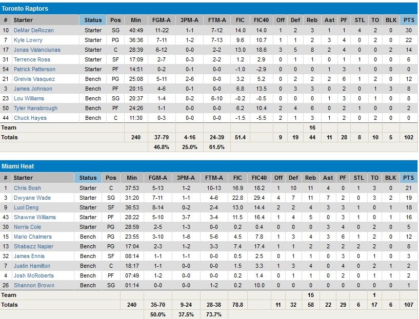 Le premier quart-temps est marqué par la réussite de Wade, qui shoote à 4/4 tout en prenant 4 rebonds et en distribuant 3 passes. C’est la deuxième fois en carrière que l’arrière rentre au moins 4 shoots sans un raté durant un quart-temps, tout en ayant autant de rebonds et de passes (6/6, 4 rebonds, 3 passes dans le troisième quart-temps d’un match contre Portland le 8 janvier 2006). Luol Deng (18 points) et Shawne Williams (16 points) ont également participé à contrer les performances de DeMar DeRozan (30 points) et Kyle Lowry (22 points) alors qu’en sortie de banc, Mario Chalmers a eu nouvelle fois été plus saignant que Norris Cole à la mène avec 12 points malgré un 3/10 aux tirs.