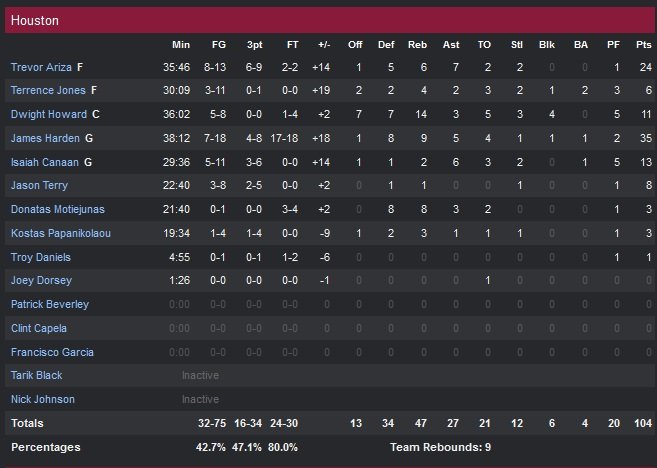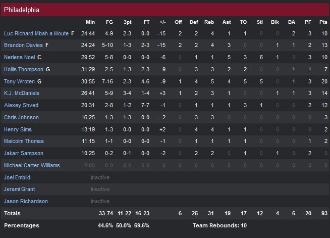 Comme souvent c’est Tony Wroten qui mène les troupes perdantes à Philadelphie (20 points à 7/16, 5 rebonds et 4 passes). K.J. McDaniels le suit avec 14 unités tandis que Nerlens Noel (auteur d’un gros contre sur le meilleur scoreur de la soirée) réalise une performance digne d’un arrière (il a quand même mis 4 quart-temps pour gober un rebond malgré ses 2,11m) avec 6 interceptions (10 points à 5/8, 5 passes et 1 contre). Les 76ers concèdent 18 lancers-francs au seul James Harden, qui rentre ses 17 premières tentatives sans trembler. En début de match, les Sixers font comme si Trevor Ariza n’existait pas et l’ailier est seul derrière la ligne, il enquille comme à l’entraînement. Houston prend 13 points d’avance. Philadelphie trouve quelques bons shoots à 3-points dans le deuxième quart et profite de la maladresse de ses adversaires pour recoller à un petit point à la mi-temps, 55-54.