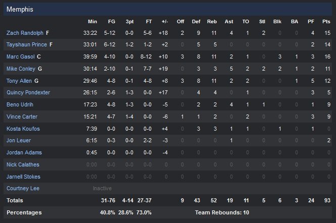 Avec trois joueurs en double-double, (Gasol, Randolph et Tony Allen, qui bat son record de rebonds en carrière avec 11 prises), Memphis a réussi à tenir New Orleans (qui ne marque que 13 points dans le premier quart-temps) à un petit 34% de réussite aux tirs tout en limitant l’apport d’un Anthony Davis (14 points à 6/12 et 8 rebonds) en mode MVP jusque-là. Malgré la bonne forme de Tyreke Evans (21 points à 7/17, 7 rebonds et 4 passes), Memphis s’est appuyé sur ses remplaçants de luxe que sont Vince Carter (9 points à 4/7) et Prince pour prendre définitivement l’avantage dans le quatrième quart-temps. L’ancien highflyer rentre un turnaround jumper qui porte le score à 71-66 en milieu de quart-temps et deux minutes plus tard Prince prend le relais avec deux paniers consécutifs bien servi par Beno Udrih, 76-68. Un écart qui sera conservé jusqu’à la fin du match et deux lancers-francs de Tony Allen qui offre la plus grosse avance du match à son équipe, 93-79.