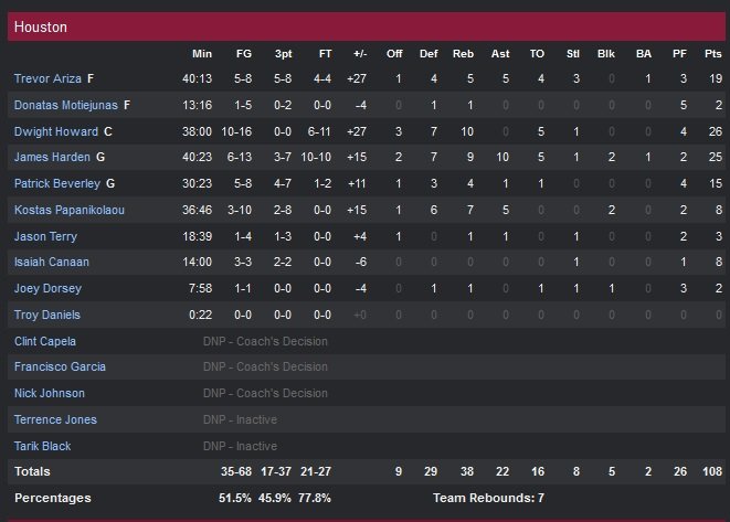 L’arrière du Heat (3V-1D) a été en réusssite durant la rencontre avec 19 points à 7/11, bien épaulé par un Chris Bosh toujours en forme (21 points) et un banc franchement correct : 12 points pour Shawne Williams et Mario Chalmers, 11 pour Luol Deng et 9 pour le petit nouveau sorti de D-League Justin Hamilton (9 points 7 rebonds), qui a replacé son équipe dans la course à plusieurs reprises grâce à ses 3-points assassins. Le quatrième quart-temps a été fatal pour les hommes d’Erik Spoelstra qui subissent un 13-0 en fin de période. Trevor Ariza n’y est pas pour rien avec ses 19 points et Patrick Beverley confirme ses progrès offensifs (15 points). Houston va ainsi infliger un 25-14 au Heat dans le dernier quart en shootant à 17/37 derrière la ligne.