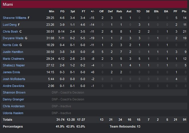 L’arrière du Heat (3V-1D) a été en réusssite durant la rencontre avec 19 points à 7/11, bien épaulé par un Chris Bosh toujours en forme (21 points) et un banc franchement correct : 12 points pour Shawne Williams et Mario Chalmers, 11 pour Luol Deng et 9 pour le petit nouveau sorti de D-League Justin Hamilton (9 points 7 rebonds), qui a replacé son équipe dans la course à plusieurs reprises grâce à ses 3-points assassins. Le quatrième quart-temps a été fatal pour les hommes d’Erik Spoelstra qui subissent un 13-0 en fin de période. Trevor Ariza n’y est pas pour rien avec ses 19 points et Patrick Beverley confirme ses progrès offensifs (15 points). Houston va ainsi infliger un 25-14 au Heat dans le dernier quart en shootant à 17/37 derrière la ligne.