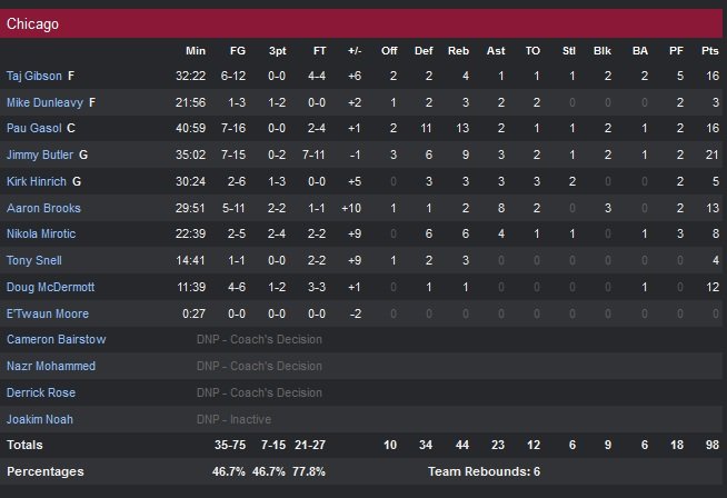 Une cheville encore légèrement douloureuse pour Derrick Rose et une petite grippe pour Joakim Noah n’ont pas empêché les Bulls d’obtenir une troisième victoire en quatre matchs cette nuit face au Orlando de Tobias Harris (21 points à 9/15 et 9 rebonds) et Nikola Vucevic (19 points à 9/22 et 13 rebonds). En l’absence de ses coéquipiers, Pau Gasol a fait le boulot avec 16 points et 13 rebonds et a été parfaitement entouré des role players habituels des Bulls : Taj Gibson signe 16 points à 6/12, Jimmy Butler apporte 21 points à 7/15 et 9 rebonds, Aaron Brooks 13 points à 5/11 tandis que Doug McDermott a fait son trou avec 12 points à 4/6 en même pas 12 minutes de temps de jeu.