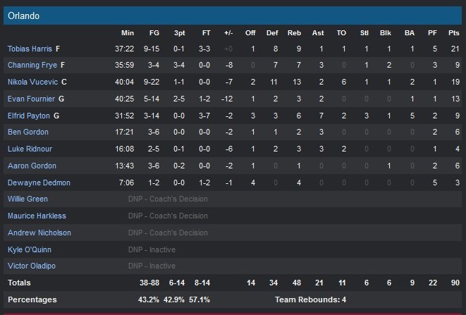 Evan Fournier joue 40 minutes pour 13 points (5/14), 3 rebonds et 2 passes mais l’apport du banc du Magic reste trop limité (19 points du banc contre 37 points des remplaçants à Chicago). Grâce à une bonne agressivité et alternance intérieur/extérieur, Orlando prend le meilleur sur les Bulls dans le premier quart-temps et mène 18-10 puis 30-24 dans les premiers instants du deuxième quart. Aaron Gordon donne même 7 points d’avance à son équipe sur un shoot avec la planche avant que son homologue rookie McDermott ne redonne l’avantage à Chicago suite à deux lancers-francs. Les deux équipes se rendent ensuite coup pour coup jusqu’à la mi-temps, qui bascule en faveur de Chicago sur un shoot de Butler à 1,2 seconde du buzzer, 54-52. Le mano à mano continue dans le troisième quart-temps, qui se conclut sur une égalité parfaite 69 partout.