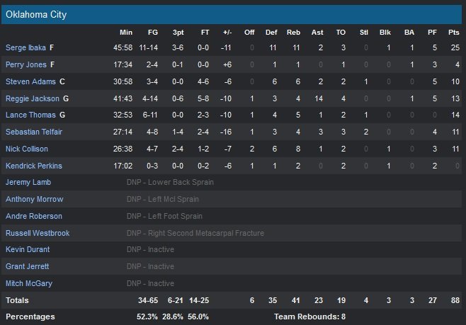 Esseulé, Serge Ibaka fait son match avec 25 points et 11 rebonds alors que Reggie Jackson soigne aussi ses stats (13 points et 14 passes, record en carrière) dans le vent. Avec 9 joueurs enregistrés à l’infirmerie, il est est vrai que ça devient sérieusement compliqué pour Scott Brooks et son staff, qui terminent le match avec 6 joueurs disponibles (Sebastian Telfair est éjecté sur une faute flagrante de niveau 2 à 1″57 de la fin du match pour mauvais geste sur Hansbrough, le monde à l’envers).
