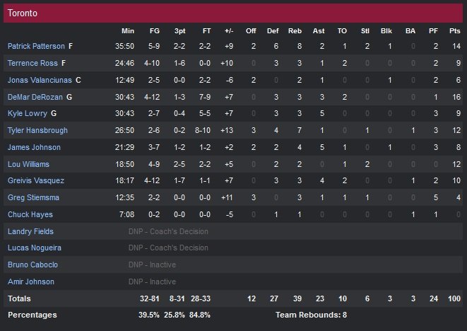 OKC avait pourtant débuté parfaitement le match avec une belle adresse que lui a donné 9 points d’avance, 30-21 en premier quart. Mais le reste du match est totalement à l’avantage des Raptors et pourtant ils ont shooté à 39.5% contre 52.3 au Thunder. Cependant comme depuis le début de saison leur agressivité a payé et ils ont obtenu 33 lancers francs. Revenus à un point à la mi-temps, les Raptors ont pris le contrôle de la rencontre dans le troisième quart, remporté 22-18 où ils ont pris jusqu’à 7 points d’avance grâce au trio Patterson, DeRozan et Hansrbough. En dernier quart les Canadiens ont plié le match en deux temps derrière le duo d’arrières Greivis Vasquez – Lou Williams. Un 7-0 pour débuter puis un 6-0 quelques minutes plus tard qui a porté l’avance à 14 points à 6 minutes de la fin.