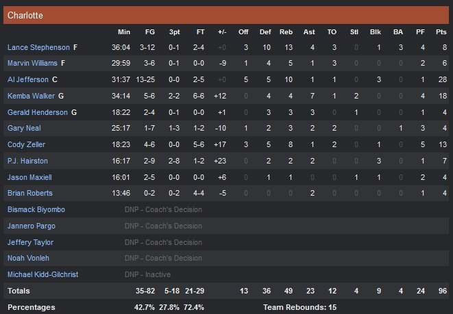 Charlotte a effacé une série de 16 défaites consécutives face à Miami en remportant son match 96-89 à domicile cette nuit. Les Hornets n’avaient tout simplement jamais gagné contre le Heat de LeBron James. Al Jefferson en a profité avec 28 points (13/25) et 10 rebonds et signe son 30e match de rang à au moins 10 points inscrits en saison régulière (il a marqué 20 points dans 23 de ces 30 rencontres). Mais le pivot n’était pas seul puisque Kemba Walker s’est bien remis de son mauvais match précédent (16 points et 7 passes) et Cody Zeller a été précieux en sortie de banc avec 13 points et 8 rebonds pour des Hornets qui comptent deux victoires et trois défaites.