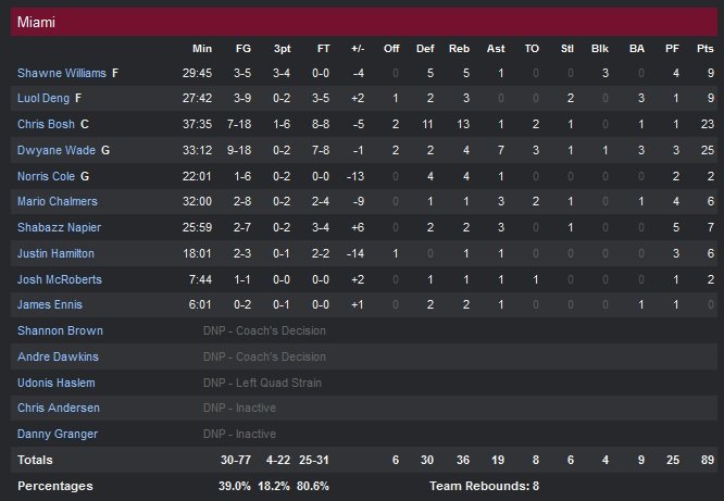 On en oublierait presque l’apport de Lance Stephenson (8 points, 1 contre) qui, toujours en délicatesse avec son shoot (27% sur ses 5 premiers matchs), s’est reposé sur les bases de son jeu combattif en gobant 13 rebonds et en distribuant 4 passes malgré un 3/12 aux tirs. Shabazz Napier a été préféré à Norris Cole (2 points à 1/6) en fin de match. Un choix payant puisque le rookie va ramener son équipe à 3-points sur un drive à 2″07 du buzzer, 88-85. Walker lui répond par un 3-points sur la tête mais Miami reste à quatre points. Les deux pertes de balles et le shoot manqué de Mario Chalmers (6 points à 2/8) vont par contre condamner Miami dans la dernière minute.