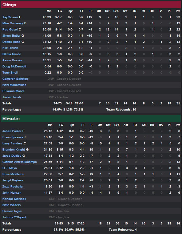 Rose a signé 13 points et 7 passes en 32 minutes mais ce sont les intérieurs Taj Gibson (23 points, 10 rebonds alors qu’il remplaçait Joakim Noah, malade, dans le 5) et Pau Gasol (22 points, 14 rebonds). Jimmy Butler ajoute 14 points et Mike Dunleavy 12. C’est en seconde mi-temps que la différence s’est faite et que la défense des Bulls a fait le boulot en limitant les locaux à 33 points et au final à un petit 37.1% aux tirs à l’image du 3/15 de Brandon Knight (10 points, 9 rebonds et 7 passes).
