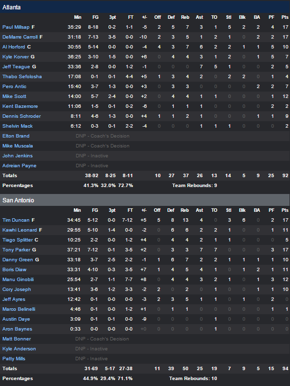 En seconde mi-temps l’écart s’est stabilisé jusqu’à deux tirs à trois points signés Pero Antic et Dennis Schröder en toute fin de quart qui ont remis Atlanta à seulement 6 points avant le dernier quart, 68-62. Alors que Ginobili et Cory Joseph avaient redonné de l’air aux Spurs en tout début de dernier acte c’est à nouveau sur deux tirs à trois points consécutifs de Mike Scott et Kyle Korver que les visiteurs se sont accrochés (74-68) et même mieux que ça puisque cela a initié à 12-2 qui les a mis à 2 points 74-76 à 8 minutes du terme. Un vrai mano a mano s’est engagé. Les Spurs sont restés tout de même devant grâce à leur joueurs expérimentés, Parker, Duncan et Ginobili mais Atlanta s’est accroché répondant à chaque tentative des Spurs de plier le match. Alors que Diaw avait donné 5 points d’avance aux siens à 4’24 de la fin Al Horford et Paul Millsap ont lancé un 9-2 qui a mis Altanta devant pour la première fois de la rencontre 90-88 avec 1’16 à jouer. Sur une faute de Korver, Ginobili a bénéficié de 3 lancers pour mettre San Antonio en tête 91-90 puis 92-20 à 18 secondes du terme après un lancer de Duncan. Mais Teague a égalisé dans la foulée avant que Manu Ginobili provoque une nouvelle faute de Korver pour donner la victoire aux siens 94-92, Pero Antic se faisant contrer par Boris Diaw sur le trois points de la gagne.