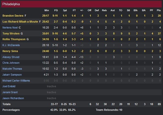 Les 76ers réalisent quant à eux leur pire début de saison (0V-5D) depuis 2001-02 et comme d’habitude, Tony Wroten mène les troupes au scoring avec 27 points à 9/16 et 8 passes mais surtout 9 ballons perdus. Brandon Davies se montre avec 20 points à 9/11 mais le reste de l’équipe est très discret et Philadelphie ne parvient pas à profiter de la maladresse extérieure (3/19) de ses adversaires en plus de se faire bouffer au rebond (50 prises à 38 en faveur d’Orlando). Comme dans quasiment tous leurs matchs cette saison, les Sixers s’accrochent pendant trois quart-temps sans réussir à faire la différence dans le money time.