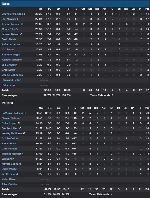 Aldridge termine avec 20 points alors que Damian Lillard signe 18 points. Nicolas Batum frôle le triple-double avec 8 points, 9 rebonds et 9 passes. McCollum et Kaman ont été très précieux puisqu’à chaque fois qu’ils sont entrés ils ont fait la différence et ils signent respectivement 13 et 12 points (à 6/6). En face Parsons inscrit 11 points mais il n’a été efficace que sur quelques minutes. Monta Ellis ajoute 14 unités.