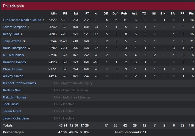 Sans Nerlens Noel depuis mercredi (entorse de la cheville), les Sixers ont pu compté sur un bon Henry Sims (16 points et 8 rebonds) alors qu’Hollis Thompson bat son record de points en carrière avec 21 unités. Luc Mbah a Moute est également efficace avec 16 points et 11 rebonds mais l’expérience des Bulls a fait la différence cette nuit. À noter que Joakim Noah a fait son retour à Chicago après avoir manqué deux matchs en raison d’une grippe, il termine à 5 points et 5 rebonds.