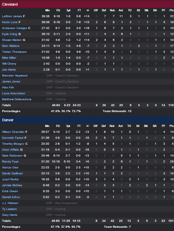 Avec un LeBron qui a partagé le temps à la mène avec Irving les Cavaliers ont bien fait circuler le ballon et ont rapidement pris le dessus sur leur adversaire dans le sillage du trio Shawn Marion (10 points), Varejao, Love qui a inscrit les 21 premiers points de l’équipe pour mener 23-7 face à des Nuggets qui ont connu un nouveau départ catastrophique dont ils ne se sont jamais remis, comme souvent depuis le début de la saison. Dion Waiters a pris le relais en fin de premier quart et l’écart est monté à 38-20 après 12 minutes. Cleveland a baissé de régime et surtout d’adresse en second quart et grâce à son adresse à trois points, Denver a pu revenir un peu grâce au trio Danilo Gallinari, Foye et Nate Robinson (14 points). Finalement à la pause tout était possible pour Denver avec 13 points de retard.