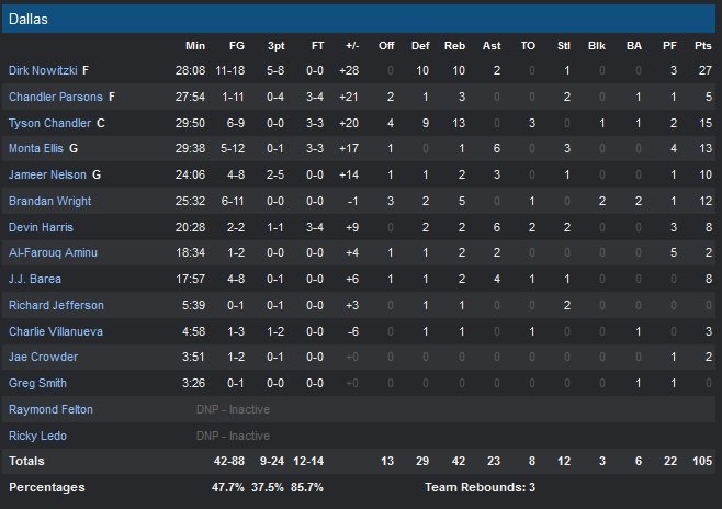 Dallas intercepte 8 ballons dans le seul premier quart-temps et marque 13 points en transition pendant qu’Utah manque 8 de ses 12 premiers shoots. Nowitzki est en pleine forme et plante à 3-points lors d’un 11-2 en faveur des Mavericks qui mènent 22-10 à 2″46 de la fin du premier quart. Utah va se remettre en selle quelques minutes plus tard pour revenir à 24-23 en début de deuxième quart. Une fois le déficit comblé, Nowitzki a repris la main. L’Allemand enchaîne trois paniers et sert Chandler pour un layup qui conclut un 15-2 en faveur de Dallas, devant 39-25. Utah se rapproche cette fois à 5 points suite à deux trois-points signé Hayward et Burke mais Nowitzki a réponse à tout avec un nouveau 3-points et une nouvelle passe décisive pour le dunk de Tyson Chandler, 45-34.